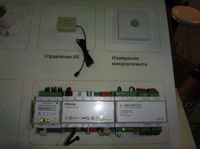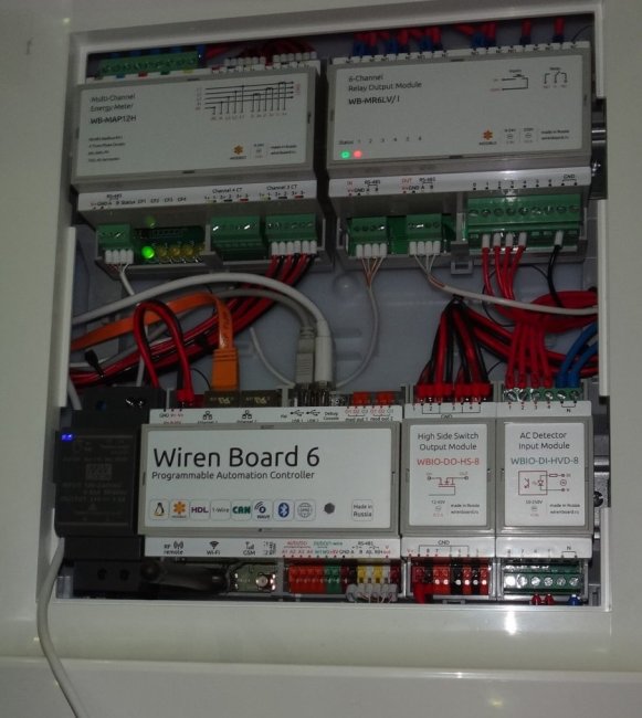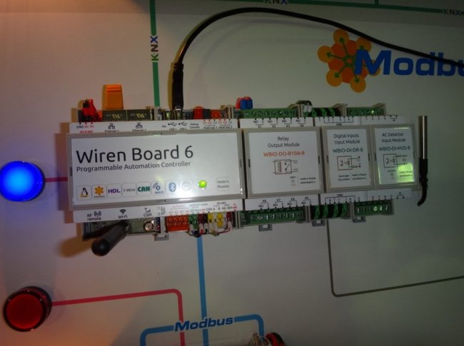 Wiren Board — это контроллеры московской фирмы Contactless для создания системы управления Умный Дом. Модули связываются с контроллером по протоколу ModBus, выпускается очень много различных датчиков, также работающих на ModBus или 1-wire. У контроллера есть интерфейсы KNX, Z-Wave (через USB адаптер), Wi-Fi, Bluetooth, HDL. Стоит всё очень недорого, на уровне контроллеров Овен, но гораздо больше функций именно под домашнюю автоматику. В общем, интересная вещь, но, на мой взгляд, достаточно «гиковская». То есть, не из серии «подключил, запустил, быстро настроил», а там поразбираться надо, форум почитать, знать linux команды. Хотя, конечно, могу ошибаться, сам не тестировал. Но проект умной квартиры на этом оборудовании делал. Вот контроллер, блок питания (чёрный) и несколько модулей расширения.