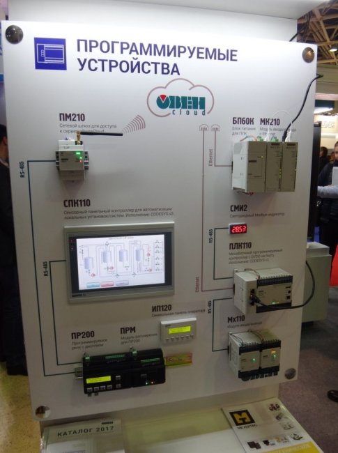 Не мог пройти мимо красивого стенда. Тут видно часто используемый в наших проектах ПЛК110, а также программируемое реле ПР200.