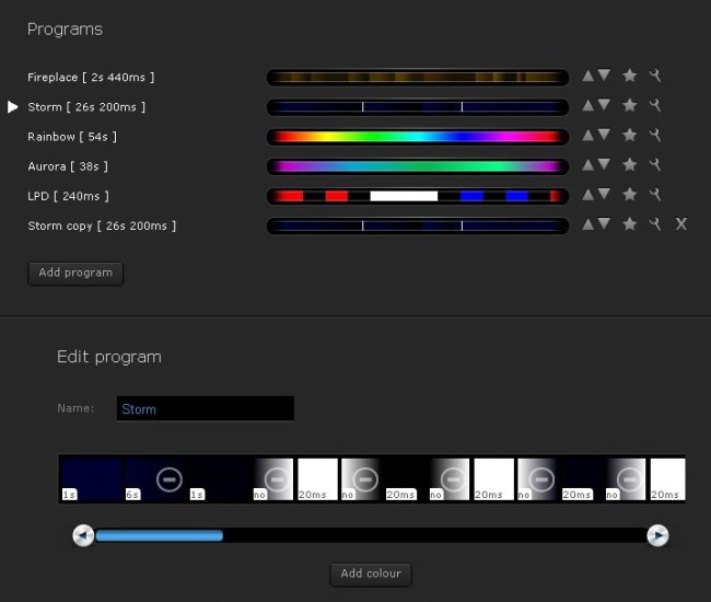 Это программа «Шторм». 1 секунду синий цвет, 6 секунд переход на более тёмный цвет, затем секунда темно-синего, затем несколько подряд короткий вспышек белого. Очень здорово получается. А «Fireplace» симулирует огонь. Можно легко создавать новые программы.