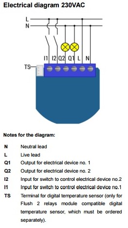 Для тестирования у меня есть два устройства: Qubino Flush 2 Relays и Qubino Flush Dimmer. По размеру они очень маленькие, влезут в подрозетник без проблем. 42x36x16мм, если точнее. Схема подключения двойного реле такова: