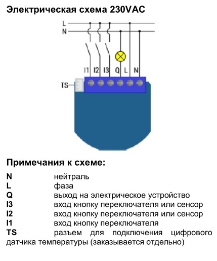 На входах поддерживаются моностабильние и бистабильные выключатели. Можно подключать датчик температуры (поставляется отдельно). Можно вместо 230В AC использовать 24В DC.
