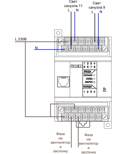 Нам надо подтянуть к щиту свет санузлов и вентиляторы. А в реле через программу Owen Logic программируем следующее: