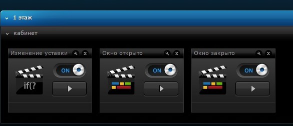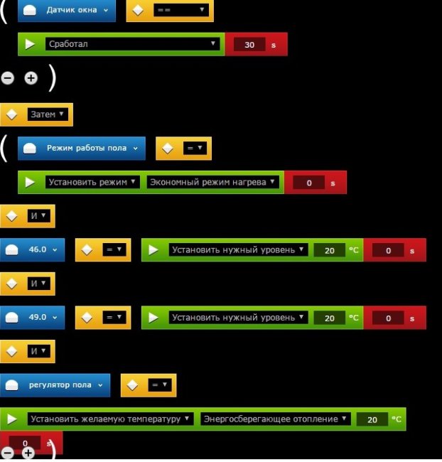 Наконец, сценарий №3 при закрывании окна выполняет сценарий 1 и уставку термостата снова помещает в радиаторы и пол:
