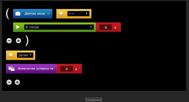 Сценарий №2 — окно открывается и уставка везде далается 20 градусов. Мы могли бы установить уставку настенного термостата, а затем выполнить сценарий №1, но тогда мы потеряем ранее выставленное значение термостата. Делаем сценарий для простоты блоками.