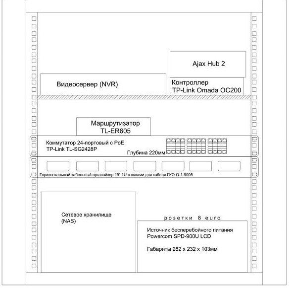 Вот для проекта слаботочных систем, кстати, формат «мини» неплохо подходит. Например, клиент сам посчитал, что ему нужно 10 видеокамер, монитор домофона, панель вызова домофона, по точке доступа Wi-Fi на каждом этаже, одну точку доступа на улице. А моя задача нарисовать схему сборки слаботочного шкафа, таблицу подключения портов коммутаторов, подобрать всё оборудование.