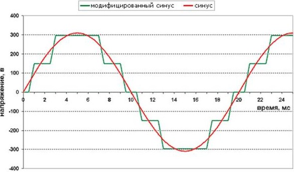Есть инверторы дешёвые, которые выдают на выходе модифицированный синус. То есть, синусоида получается ступенчатой, как на картинке.