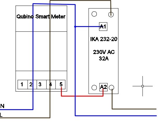 Выход модуля №5 позволяет управлять контактором. В частности, Qubino предлагает использовать бистабильное реле IKA232-20 с двумя группами контактов и мощностью коммутации до 32А. А измеряемая модулем мощность — до 65 ампер. Вот схема подключения реле: