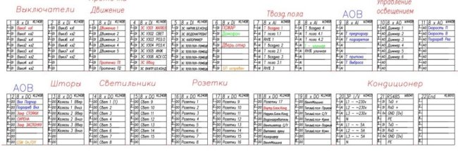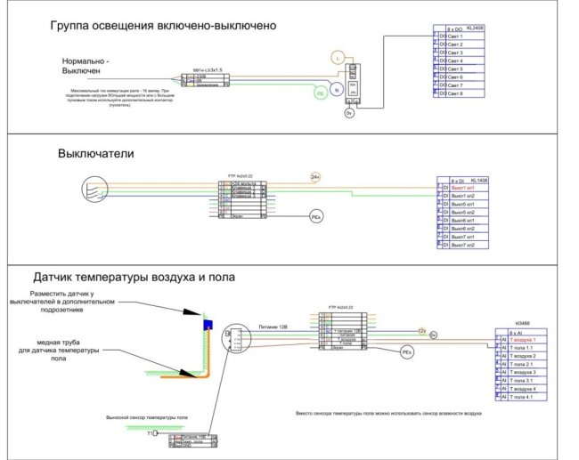 И ещё важная схема — схемы подключение элементов. Как подключается к контроллеру каждый элемент: выключатель, датчики разных типов, свет, шторы и прочее.