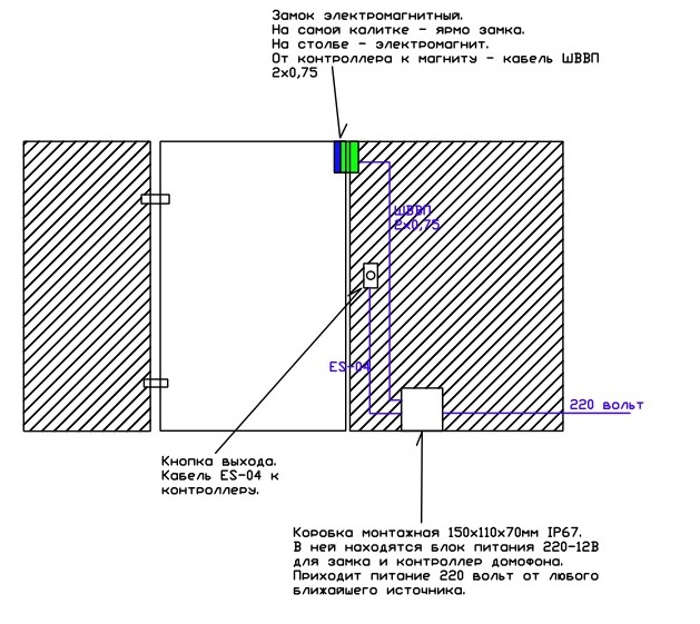 Такие структурные схемы есть для большинства слаботочных систем (компьютерная сеть, домофон, домашний кинотеатр). Вот схема монтажа кабелей на калитке для простой системы с электромагнитным замком: