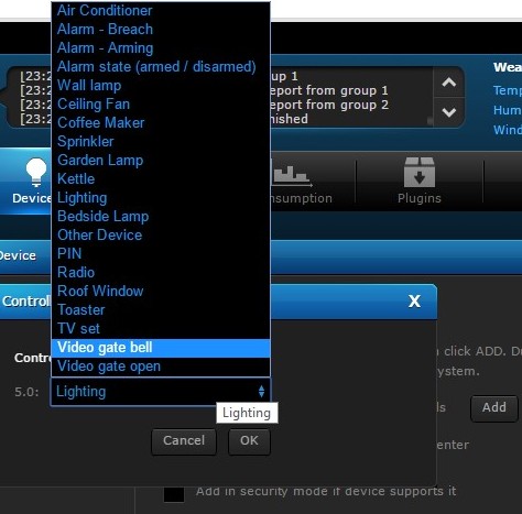 Дальше имеет смысл добавить устройства. Захожу в Devices, там пока только одно устройство — Погода с текущим прогнозом из интернета. Я могу связать данные погоды с любыми другими устройствами и сделать какую-то удобную логику. Нажимаю «Добавить устройство» и вижу окно, где предлагается добавить устройство, удалить устройство, добавить IP камеру или добавить виртуальное устройство. Виртуальное устройство — это как раз что-то типа прогноза погоды. Или механизм управления техникой по HTTP. То есть, не физическое устройство, а алгоритм.