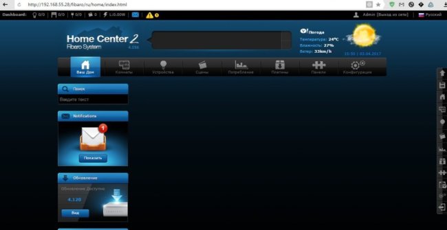 Распаковка Для моей задачи был приобретен контроллер Z-Wave Fibaro Home Center 2. На момент написания статьи это самый крутой контроллер Z-Wave из выпускаемых, стоит 54 тысячи рублей. Выглядит довольно неплохо. У него, в отличие от пластикового Home Center Lite, алюминиевый корпус, и он сам более крупный. Сначала я даже не понял, где у него все подключения, прошлось открыть инструкцию (одна страница А4) и понять, что нужно отвинтить левую стенку. Стали видны разъём питания (в комплекте адаптер в розетку 12 вольт 4 ампера), разъём Ethernet, 4 USB (в один из них вставлена флешка с символом «красный крест», для аварийного восстановления и бэкапа) и два аудио-разъёма для микрофона и динамика (это для голосового управления системой). Первое включение Антенна на устройстве — это антенна для сети Z-Wave, а не Wi-Fi. Wi-Fi у Home Center нет. Включаем устройство в розетку, оно начинает мигать лампочками. Согласно инструкции, скачиваем из раздела Support сайта fibaro.com утилиту Fibaro Finder. Она есть для Windows и Mac. Сначала программа ничего не нашла, но я заметил, что горит светодиод, который по инструкции означает «Software Update in Progress» и решил подождать. Видимо, контроллер сам подключился к интернету и начал обновляться. Я оказался прав — через 5 минут лампочки помигали и зажглись только «Питание», «Подключение к сети» и «Подключение к интернет». Упрамая программа Fibaro Finder так и не обнаружила контроллер в сети. Но контроллер же в сети, судя по лампочке! Я запустил утилиту поиска всех устройств в локалке, нашёл новый IP адрес и зашёл через браузер на контроллер. Тут уже есть русский язык, значит, не обманули. По умолчанию логин и пароль admin. Вижу главный экран Fibaro. Пока всё красиво. Не знаю, погоду в каком городе он показывает мне в правом верхнем углу, но это градусов на двадцать выше, ем у меня за окном. Написано, что доступно обновление до версии 4.120. Раз доступно, то буду обновляться, почему нет. Обновлялся и загружался контроллер минут 7-8. Затем при входе выдал окно «мастера настройки» Предложено сразу сказать мобильное приложение. В App Store нашлись Fibaro fir iPhone, Fibaro for iPad и Fibaro Intercom (приложение для связи между комнатами). Пока оно скачивается, смотрю интерфейс. При каждом переключении на другое окно браузер грузит страницу, наверное, секунд 10, это неприятно. Использование процессора 1%, использование памяти RAM 26%, память системы забита на 41%, память для бэкапов забита на 23% (интересно, что там столько занимает). В настройках LAN стоит DHCP, удаленный доступ разрешен по умолчанию. Быстро пробежался по настройкам, выставим часовой пояс и место (сразу погода стала правильно отображаться). Начнём с добавления комнат. В вкладке Rooms добавил две секции: 1 этаж и 2 этаж, потом добавил несколько комнат на каждом этаже. После нажатия кнопки «Добавить» страница каждый раз перезагружается целиком, приходится ждать. Добавление розетки Дальше имеет смысл добавить устройства. Захожу в Devices, там пока только одно устройство — Погода с текущим прогнозом из интернета. Я могу связать данные погоды с любыми другими устройствами и сделать какую-то удобную логику. Нажимаю «Добавить устройство» и вижу окно, где предлагается добавить устройство, удалить устройство, добавить IP камеру или добавить виртуальное устройство. Виртуальное устройство — это как раз что-то типа прогноза погоды. Или механизм управления техникой по HTTP. То есть, не физическое устройст