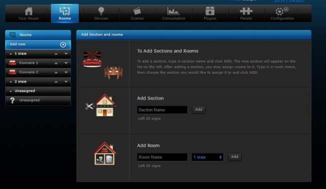 В настройках LAN стоит DHCP, удаленный доступ разрешен по умолчанию. Быстро пробежался по настройкам, выставим часовой пояс и место (сразу погода стала правильно отображаться). Начнём с добавления комнат. В вкладке Rooms добавил две секции: 1 этаж и 2 этаж, потом добавил несколько комнат на каждом этаже. После нажатия кнопки «Добавить» страница каждый раз перезагружается целиком, приходится ждать.