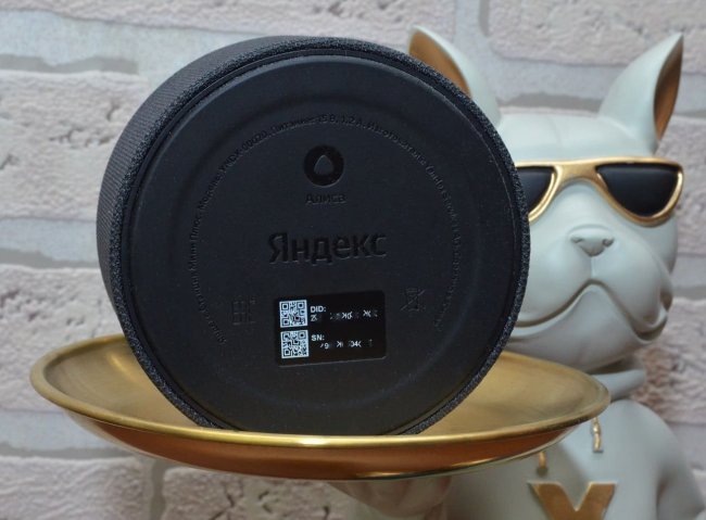 Корпус колонки обтянут сетчатой тканью одного из четырёх цветов: чёрной, белой, синей или красной. Колонка имеет форму невысокого цилиндра высотой чуть больше пяти сантиметров и диаметром около десяти сантиметров. С одной стороны торцевой части колонки можно видеть резиновый «язычок» с буквой «Я», а с противоположной стороны находятся вход для электрического кабеля, вход для подключения к более мощной колонке и кнопка отключения микрофона. Кстати, в первой и Лайт версии электричество на колонку подавалось через USB-порт. Тут же производитель решил сделать круглый штекер. По сути это конечно без разницы, но в случае выхода из строя зарядного устройства придётся покупать оригинал. От старого смартфона зарядку уже не получится использовать. Что же касается кнопки отключения микрофона, то на наш взгляд она не нужна, так как её наличие противоречит предназначению умных колонок. Однако Яндекс снабжает такими кнопками все свои устройства.