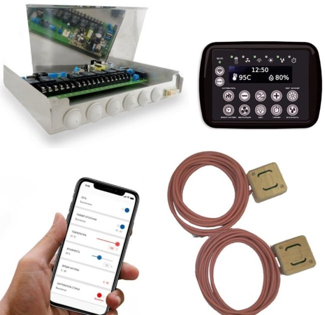 Комплект «Невотон Комфорт» состоит из блока коммутации и настенного пульта. Блок коммутации — это модуль, к которому подключаются пульт управления, нагревательные ТЭНы сауны (каменка), парогенератор, датчики температуры и влажности, светильники (в том числе диммируемые) и вытяжной вентилятор. Вот так выглядит комплект оборудования: