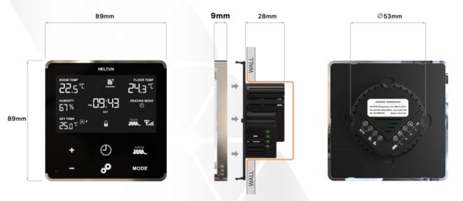 Термостат выпускается в белом и чёрном цвете. Есть модификация для управления фанкойлом, с дополнительной кнопкой управления.