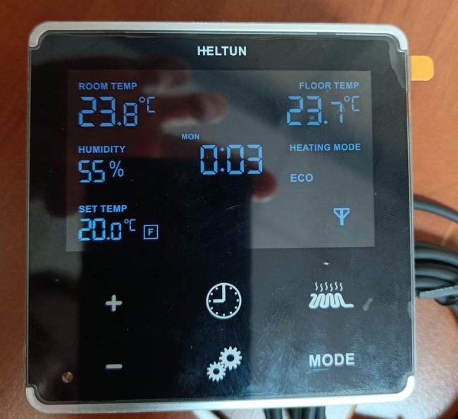 В целом термостат очень понравился. Красиво выглядит, яркий и чёткий экран, показывает сразу всю необходимую информацию. При изменении уставки температуры в приложении меняет уставку на экране почти мгновенно.