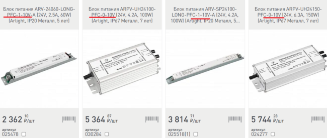 Существуют два разных стандарта сигнала: 0-10 вольт и 1-10 вольт. 0-10 американский, а 1-10 европейский, регламентируются разными ГОСТами, но они у нас примерно в равной степени используются. У Arlight есть диммируемые блоки питания (хотя, правильнее было бы сказать «диммирующие») с напряжением управления как 0-10, так и 1-10.