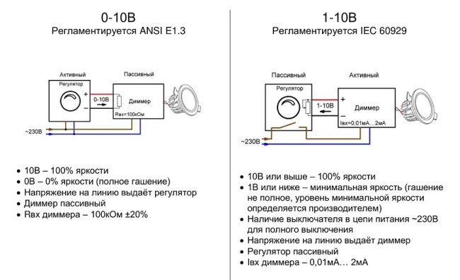 А если сигнал выдаёт настенная поворотная панель, то стандарт должен быть точно таким, какой поддерживается блоком питания. Основное отличие в том, что в стандарте 0-10 вольт панель пассивная, а в стандарте 1-10 вольт — активная.