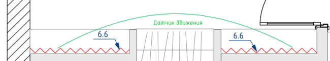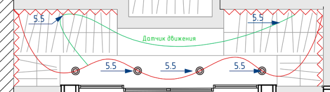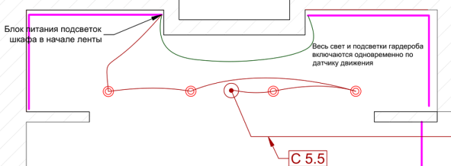 Посредине гардеробной на потолке датчик движения (одного достаточно, там всего 3 метра ширина помещения), от него кабель 3х1.5 на светильники, затем на блок питания в полке шкафа, от него 2х1 на ленты. Было бы неплохо указать точные высоты вывода кабелей в полки шкафов, но, к сожалению, данных о том, что эти шкафы будут собой представлять, на момент проектирования нет.