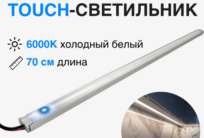 Чаще всего светильники/ленты и выключатель для них встроены в конструкцию кухни. Это может быть сенсорный выключатель, как на картинке выше. Тогда нужно просто предусмотреть вывод питания от какой-то розетки для подключения светильников.