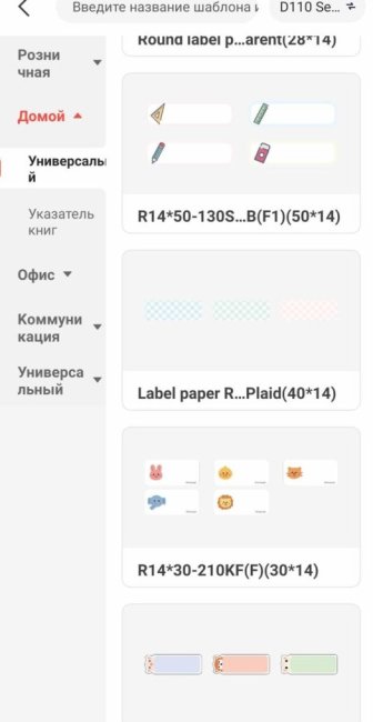 Если мы используем катушки наклеек производителя Niimbot, то принтер определяет тип наклеек самостоятельно, в катушки встроен чип. И это очень здорово. Либо можно самостоятельно выбрать шаблон бумаги. Есть очень много разных видов наклеек для Niimbot, разных форм и с картинками. Вот выбор шаблона: