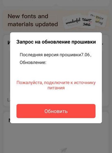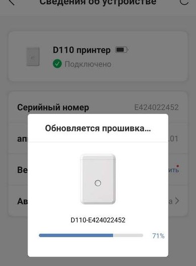 Приложение сразу нашло принтер и подключилось к нему по Bluetooth. Первым делом предложило обновить прошивку.