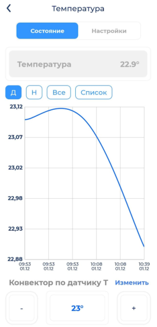 В приложении HiTE PRO я создал автоматизацию климата, в которой датчика температуры управляет конвектором. После этого, если нажать на показания температуры на экране «Дом», я вижу график температуры и кнопки для изменения уставки.