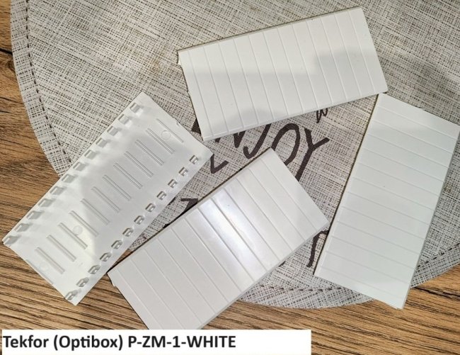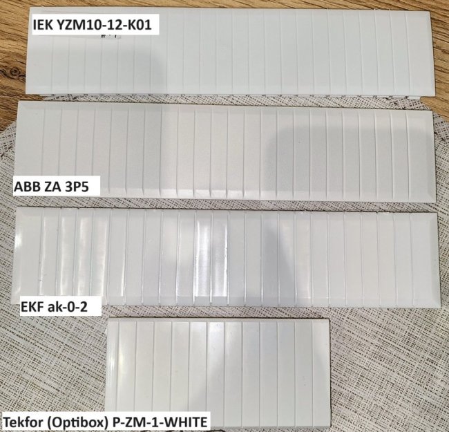 Внешне они немного отличаются от ABB. Выглядят так, как будто сделали одну очень длинную заглушку и поломали её руками по 6 модулей, поэтому края не совсем ровные. Фаска вдвое меньше, чем у ABB. Поверхность заглушек Tekfor гладкая глянцевая, у ABB шершавая матовая.