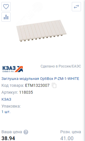 И последняя из рассматриваемых — заглушка КЭАЗ, она же OptiBox, она же Tekfor. В наименовании этого бренда довольно много путаницы. Ширина у них не 12, а 6 модулей, это важно учитывать.