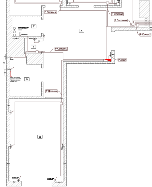 Изначально в этом проекте монтажные коробки были расположены в других местах, а траектории кабелей отличались, но после монтажа я подправил проект до соответствия действительности. Так рабочий проект превращается в исполнительный. Требовать от монтажников, чтобы они прокладывали кабель точно так, как было нарисовано изначально, не следует — я всегда считаю, что строителям на месте виднее, как удобнее сделать.