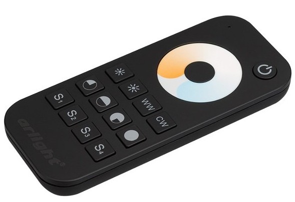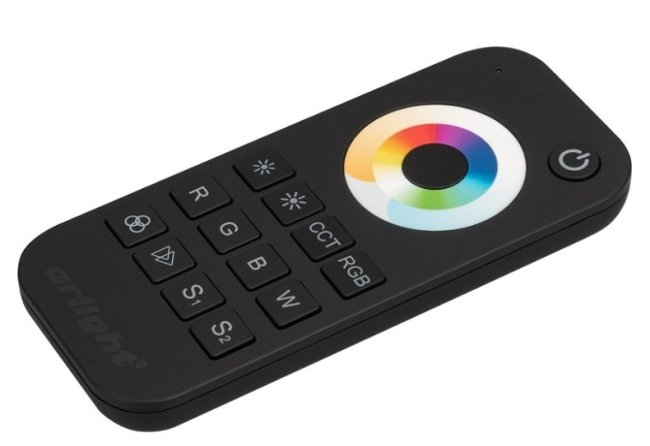 Тут уже целых 6 точек подключения, у всех каналов общее питание +24 вольта. Одного модуля управления лентами Wirenboard или Larnitech не хватит для управления такой лентой, надо два использовать. Либо, если у нас не умный дом, берём специальный контроллер для этой ленты и вот такой пульт: