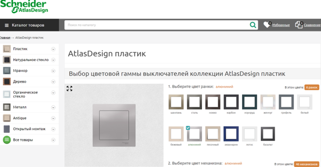 Для всей квартиры использовалась электрофурнитура цвета Алюминий. Светло-серый, если по-простому. У пластиковых элементов Atlas Design целых 14 вариантов цвета.