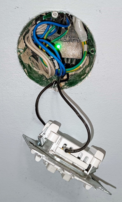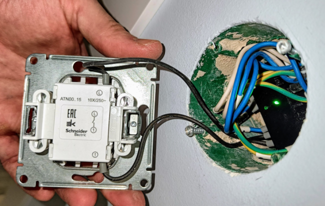 Модуль в подрозетнике с подключенным выключателем выглядит так: