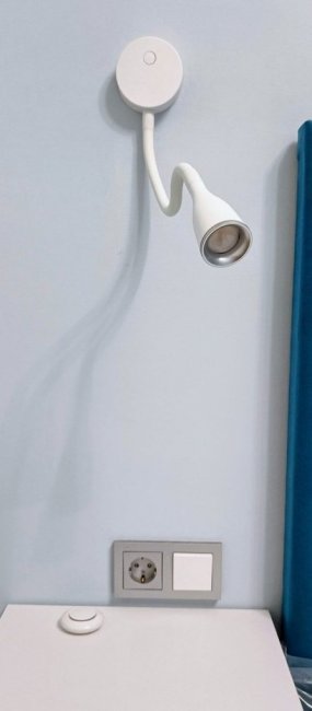 Беспроводные выключатели устанавливаются в рамки с розетками над прикроватными тумбами, но не требуют подрозетника. Сзади они плоские, крепятся к стене на двухсторонний скотч (в комплекте) или саморезы. В проекте я не указал их вообще, чтобы строители не путались и случайно не поставили подрозетник. Разумеется, строители думали, что над тумбой будет одна розетка, и расположили её на одной вертикальной оси со светильником. И когда добавился выключатель, получилось, что центр рамки не совпал с осью светильника и центром тумбы.