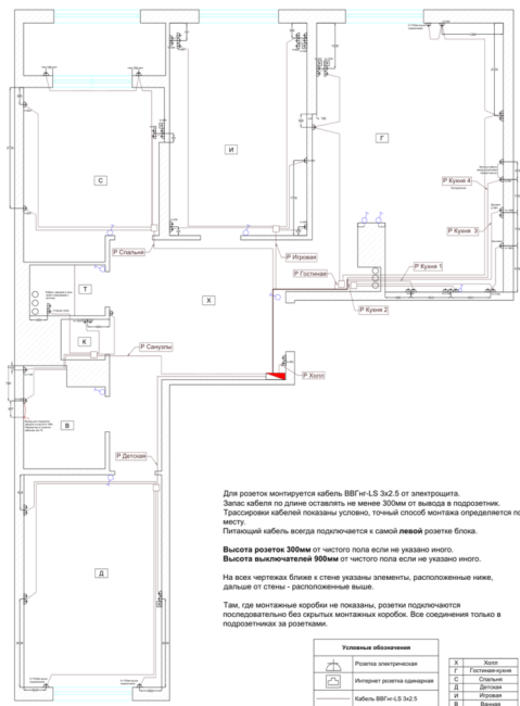 Обозначены все монтажные коробки, размерные привязки, траектории кабелей. Обозначено, в какую розетку входит кабель питания и как подключаются розетки на разных уровнях. Именно так и должен выглядеть проект (либо исполнительная схема) кабелей розеток, независимо от их сложности и наличия какой-либо автоматики.