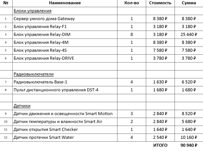 Пластиковые элементы цвета «алюминий» на всю квартиру обошлись в декабре 2023 в сумму порядка 30 тысяч рублей. Куплены в ЭТМ, срок поставки 2 дня. Это розетки, выключатели, рамки, интернет-розетки. Все выключатели типа «нормально-открытая кнопка» для работы с модулями управления HiTE PRO.