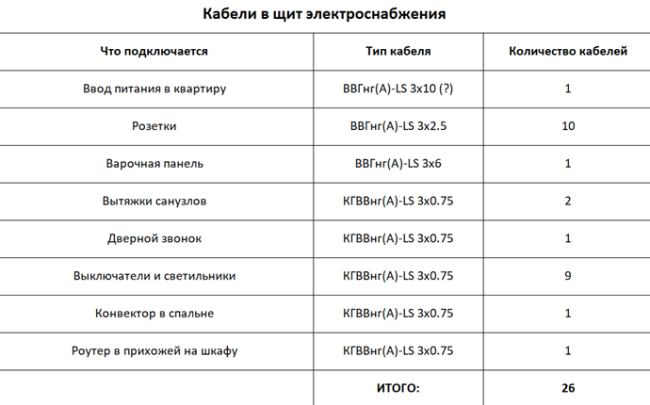 Стоит отметить, что для кладовки и двух санузлов сделан один кабель розеток от щита. С учётом возможной подключаемой техники ток не будет превышать 16 ампер. Но если бы, например, в кладовке предполагалась установка стиральной и сушильной машин, стоило бы распределить кабели по-другому.