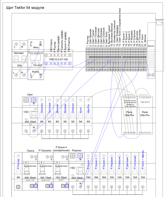 Ввод питания через автомат номиналом 50 ампер категории В. Затем реле напряжения и кросс-модуль. Одно УЗО на весь свет и модули HiTE PRO, другое на все розетки. УЗО используются типа А. Плита на отдельном дифавтомате для удобства подключения. Холодильник на отдельном дифавтомате, чтобы можно было всё отключить, а его оставить. Роутер тоже отдельно, он без УЗО, так как это всего одна розетка без заземления. Розетки санузлов на отдельном дифавтомате с током утечки 10мА. Номиналы автоматов розеток комнат занижены до 10 ампер ради паранойи.