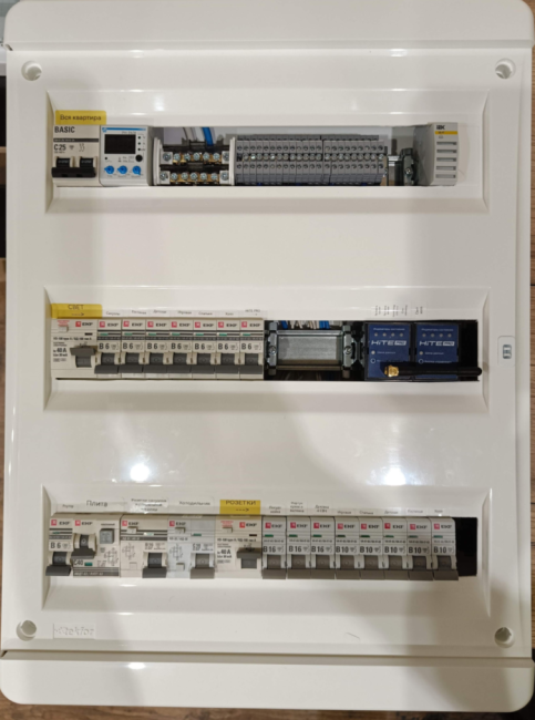 Вводной автомат и УЗО розеток на фото — временные. Вводной автомат будет заменён на B50, а УЗО розеток на 50А. У EKF были задержки в поставках некоторых модулей.