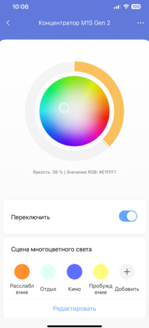 На стартовой странице приложения мы видим панель управления для устройства “Ночник”. Если ее открыть, то появится кольцо, регулирующее яркость и палитру цветов ночника. Внизу находится переключатель для включения/выключения подсветки, а также предустановленные пресеты для быстрого выбора.