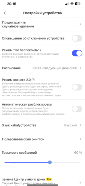 В разделе “Настройки устройства”, втором пункте меню, предоставлены расширенные конфигурации, такие как защита от случайного удаления, режим “Не беспокоить”, который отключает все голосовые и световые уведомления, а также настройки языка и громкости голосовых оповещений.
