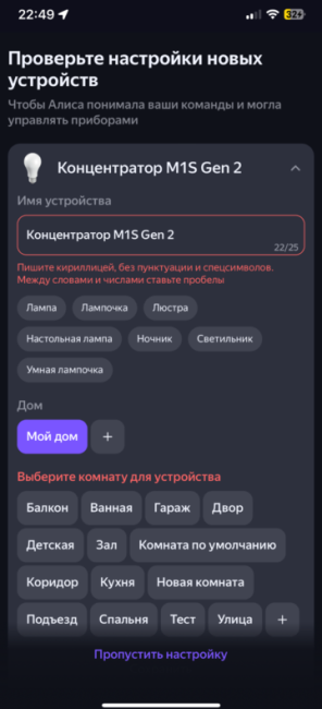 Шаг 3: В приложении умного дома Яндекса нажмите на кнопку «Обновить список устройств». После обновления необходимо настроить ваши устройства, а именно – присвоить имя (оно должно быть написано на русском языке), указать дом и комнату.