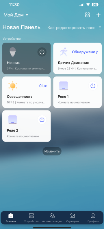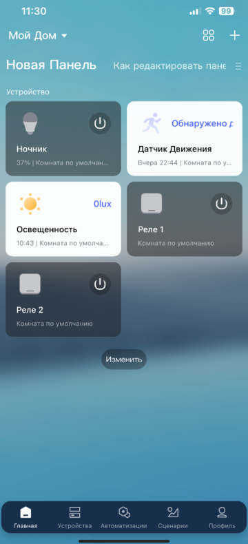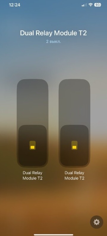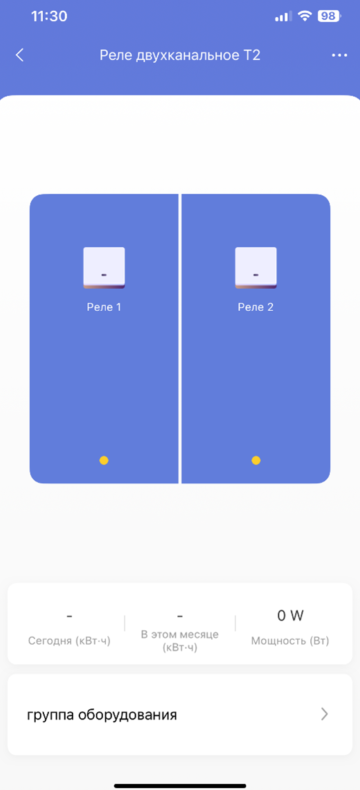 После завершения процедуры добавления устройства, вы увидите стартовую страницу приложения и две плитки управления «Реле», каждая из которых отвечает за свой канал.