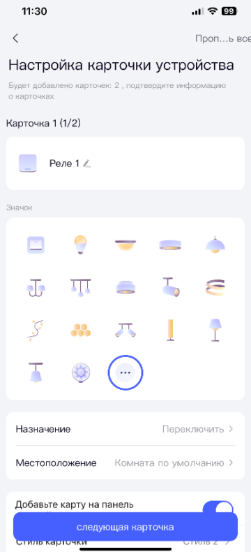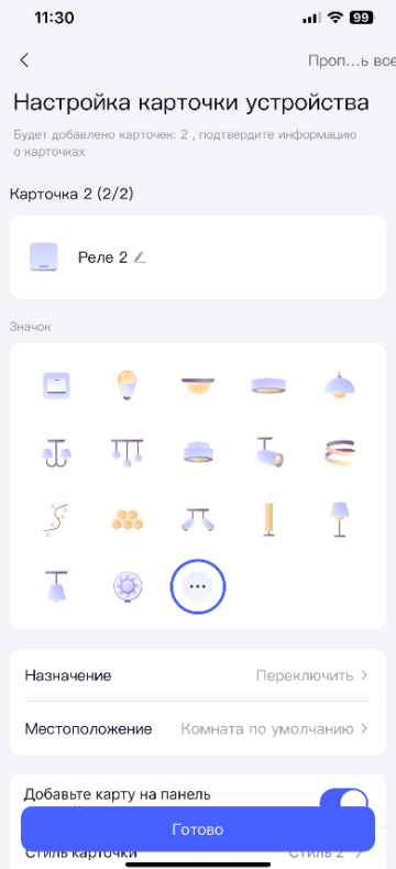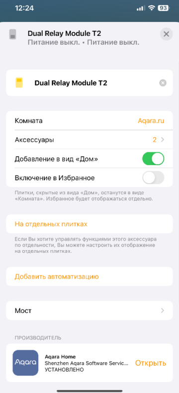 По умолчанию оба реле находятся на одной плитке, открыв настройки их можно разделить (обратите внимание, что даже после разделения реле, добавить их в разные комнаты нельзя). В настройках также можно изменить имя, тип, иконку аксессуара.