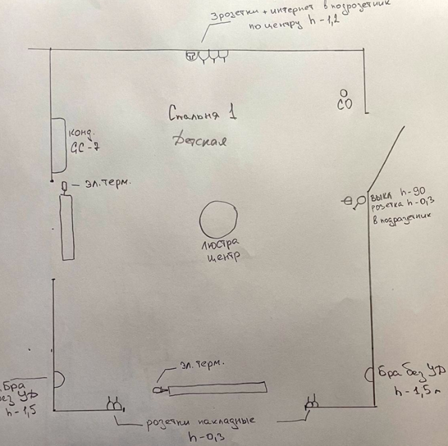 Я уже писал, что могу работать даже если вообще нет дизайн-проекта. Тогда заказчик может передавать мне пожелания по местам установки элементов электрики вот в таком виде: