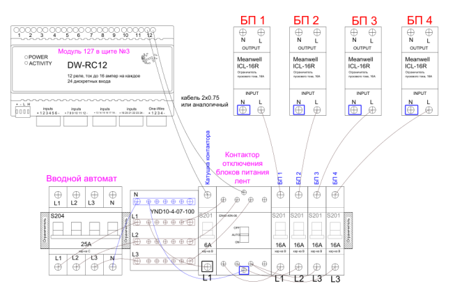4 блока клемм на верхней рейке — ленты, подключаемые к четырём блокам питания.