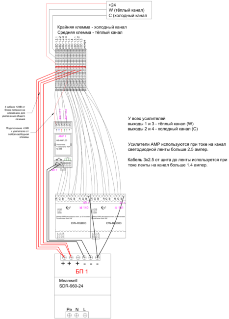 Объединить питание +24В от блоков питания. Если посмотреть схемы подключения лент к усилителям WB-AMPLED и DW-RGB03, то увидим, что питание должно подаваться на ленты отдельно, не с этих блоков. Важно ещё учитывать, что максимальный ток от каждого блока составляет 40 ампер.