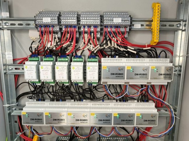 Важно проверять, что реальная длина лент соответствует расчётной. Чтобы не получилось, что там, где расчётный ток был 2 ампера на канал, получатся все 4, потому что решили сделать дополнительный контур подсветки. В щите есть место для установки дополнительных усилителей.
