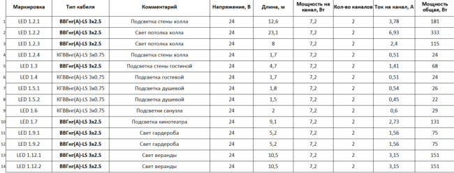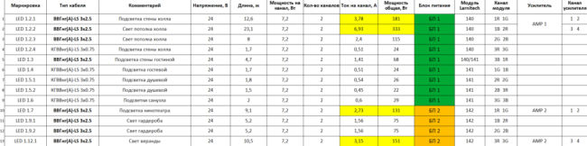 Я сделал таблицу, в которую свел все светодиодные ленты дома. Вот часть этой таблицы: