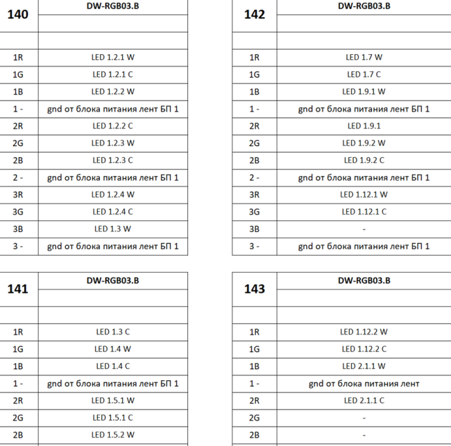 Количество модулей DW-RGB03 — 9 штук, с учётом нескольких свободных запасных выходов. Вот фрагмент цоколёвки модулей Larnitech. Да, у меня в проекте очень много таблиц.